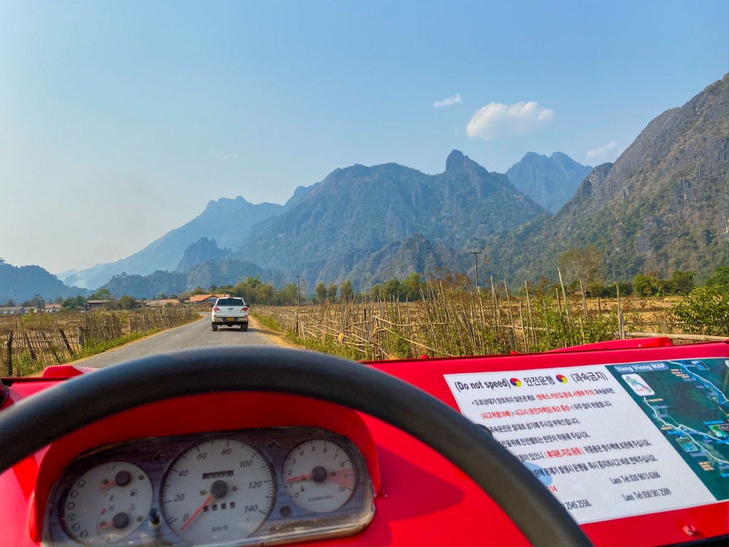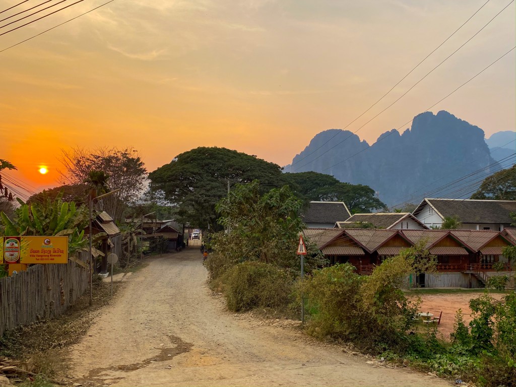 Na een wat ruige busrit door zandweggetjes in de bergen van Luang Prabang kwam ik vrij comfortabel aan in Vang Vieng. Vrij gelijkwaardig aan Luang Prabang, het is vrij klein. Maar wel even lekker als stop om een dagje of twee niks te doen, en dan ook echt niks. Ik heb echt kunnen genieten hoe de stuurmanskunsten van de buschauffeur waren door het bergachtige zandpad, waarbij je een halve meter van de afgrond rijdt en je de banden voelt driften over het pad. Na een tijdje kijk je er niet eens meer van op en ben je maar je eigen tijd aan het doden.