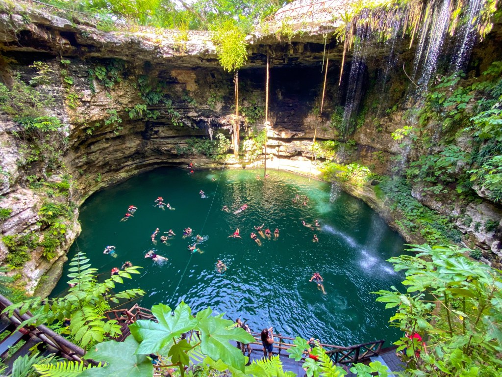 Van deze pyramide gingen we door naar een van de duizenden cenotes in Mexico. Een groot ondergronds waterparkje was hier te vinden. Met een verplicht zwemvest aan ben ik het water in gesprongen, om even af te koelen van het toch wel warmere weer hier. Een heel relaxed plekje om in het water te zitten, weliswaar tussen vele andere toeristen. In het filmpje wat korte fragmenten waar ik mezelf ter water laat flikkeren!