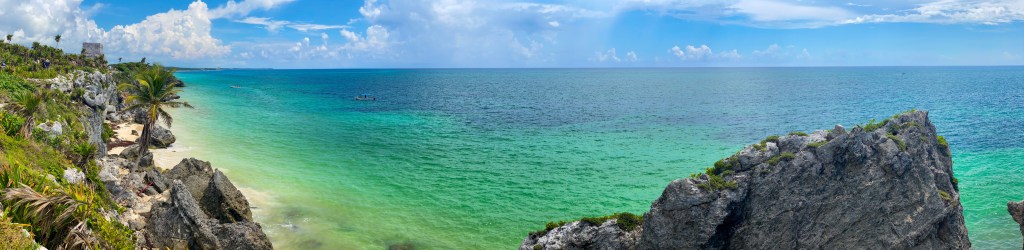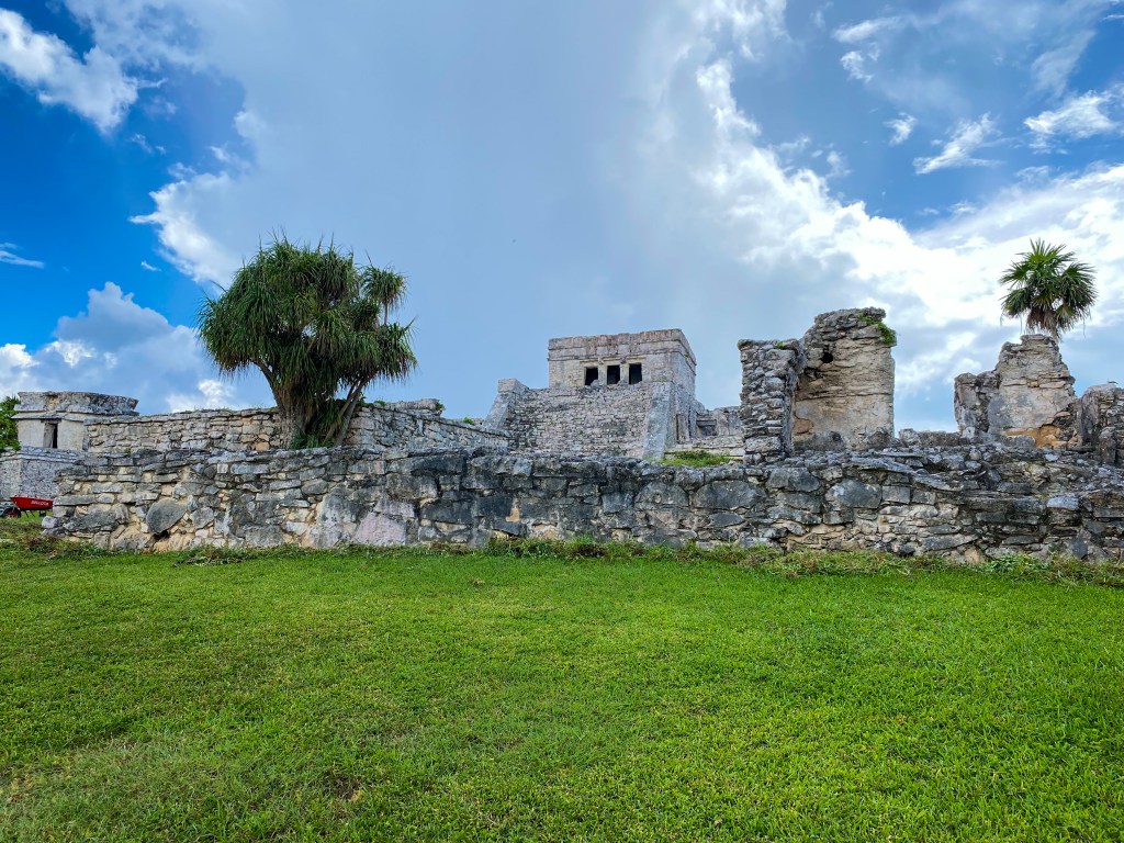 Tulum heeft ook een archeologische plaats met wederom (en ook de laatste keer bij de blog) bouwwerken van de maya’s. Het was ook de handelspoort op dat moment van Mexico en het was dicht op de kliffen gebouwd, waarbij de andere zijde was omringd met een muur. Een stevig fort dus. Alles wat je aan goederen kon bedenken werd hier verhandeld. Aangezien het aan de kliffen ligt is het ook een mooi uitzicht over de Caribbean.