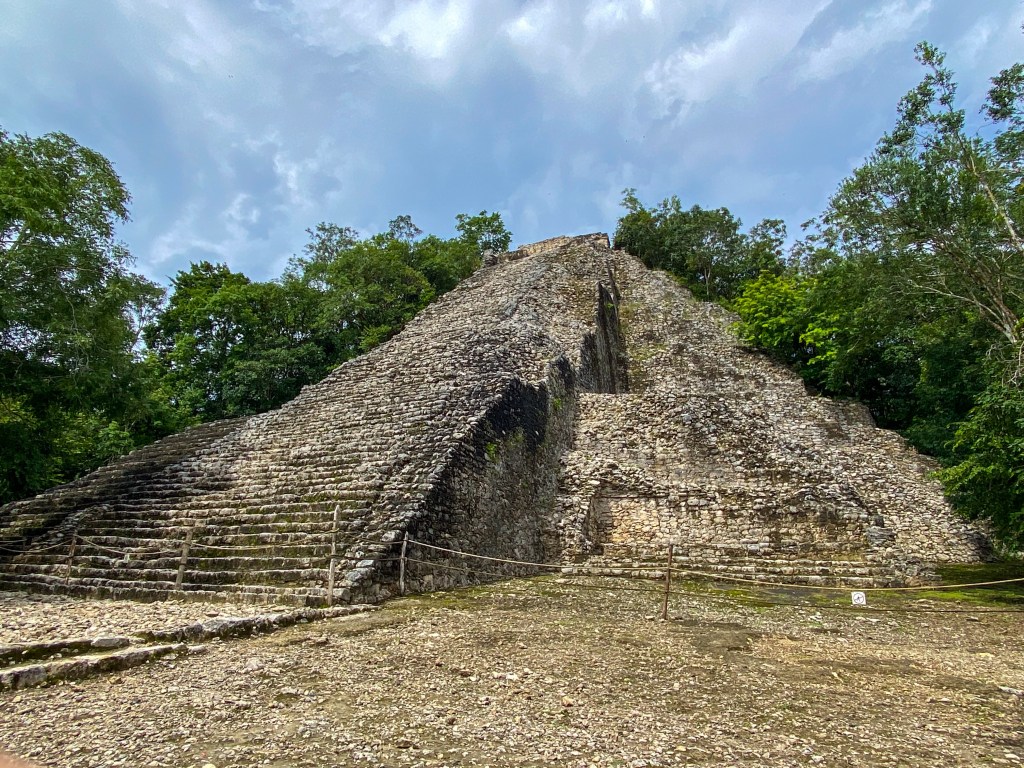 Na deze archeologische tocht vervolgenden wij de tour naar Coba, een klein dorpje met ook een archeologische plaats. Het was ondertussen keihard gaan zeiken, dus iedereen overwoog zijn levenskeuzens of ze het wilden gaan bekijken. Uiteindelijk stopte de regen grotendeels toen we uitstapten, dus gingen iedereen toch maar op bad. Over een zanderig pad, wat ondertussen een moeras was geworden, kwamen we aan bij de grootste pyramide van het complex. Het was vergelijkbaar met Chichen Itza, maar een stuk minder gerestaureerd c.q. onderhouden.