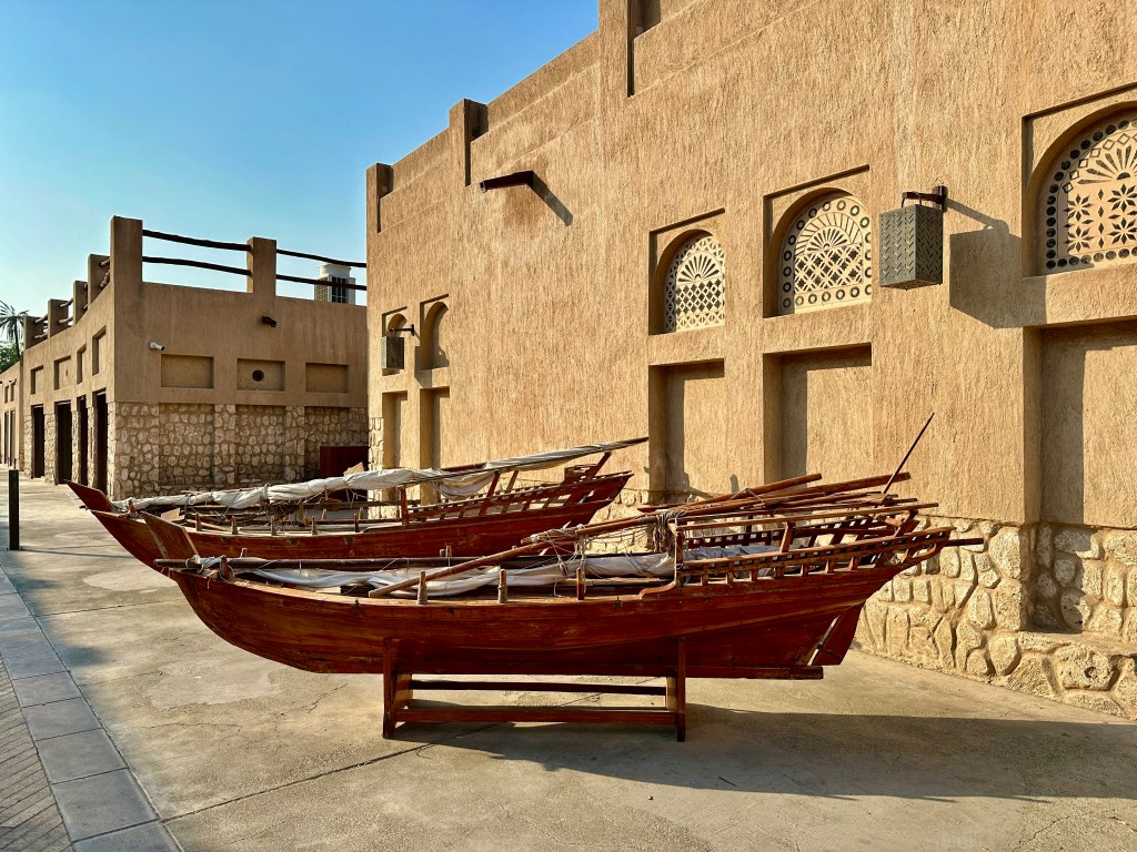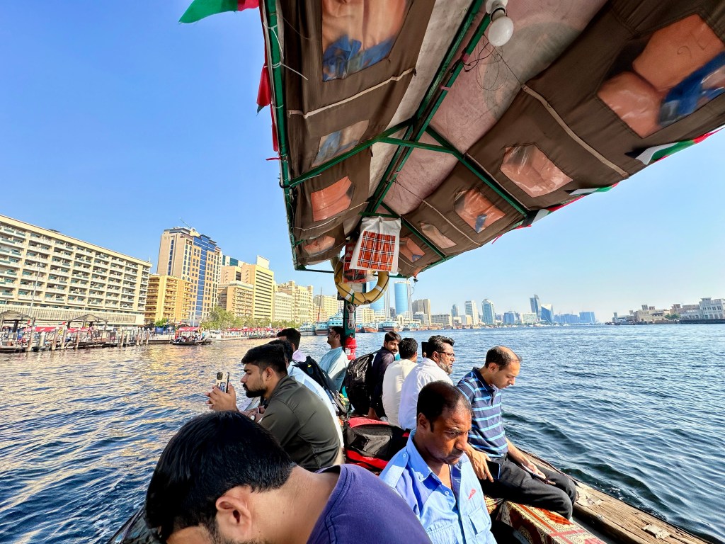 Na een goede douche op dag 2 en eventjes de hernia eruit te rekken van de eerste nacht in de Emiraten toch maar eventjes wat van de stad gaan verkennen. Dag twee stond in het teken van de oude stad van Dubai, Al Fahidi. Na een stukje wandelen langs de Khor Dubai (het enige water dat de stad opdeelt), heb ik een Abra naar de overkant genomen. Dit is een boot waar je voor 1 Dirham (25 cent) naar de overkant kan. – Sidefact: ongeveer 90% van alle inwoners zijn immigrant in dit land, waaronder velen uit Bangladesh en Pakistan. Ik heb op deze dag ook niet veel andere mensen gezien. –