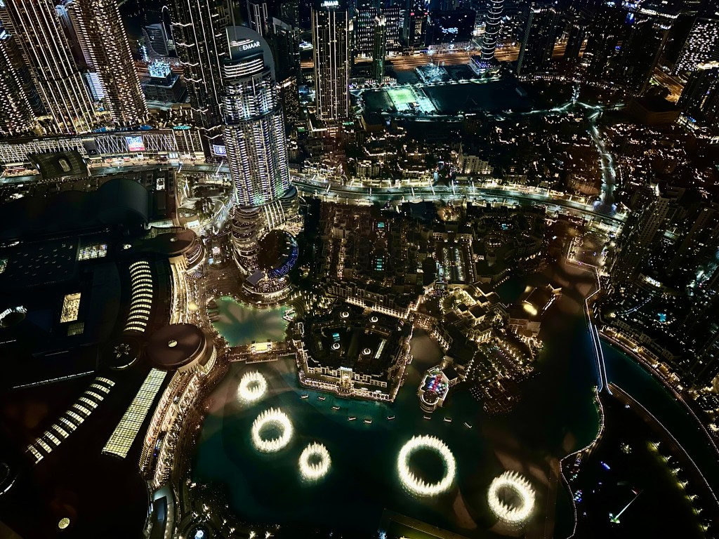 Oorspronkelijk dacht ik dat ik na anderhalf uur al moest wieberen, maar nadat ik enkel een sticker op m’n borst gedrukt kreeg met ‘Sky VIP’ werd ik niet herkend. Daarmee ben ik lekker lang in de lounge daar van het uitzicht gaan genieten en wat gratis sapjes gedronken tot het donker werd om nog een mooi plaatje te trekken. Ik kwam er ook achter dat de Burj Khalifa nooit op het rioleringssysteem is aangesloten – waardoor elke dag dus een konvooi van vrachtwagens met pure schijt wegrijdt. Toen ik op de 148e verdieping een sanitaire voorziening zag, kon ik het uiteraard niet laten daar mijn bijdrage aan te leveren. Voor de mensen die bekend zijn met het spel SimCity, dat is wel een beetje hoe deze stad voelt. Er is een onwijs fancy centrum en af en toe een hele boel highrise bij elkaar, maar de rest ziet er uit alsof er weinig tijd aan is besteed.