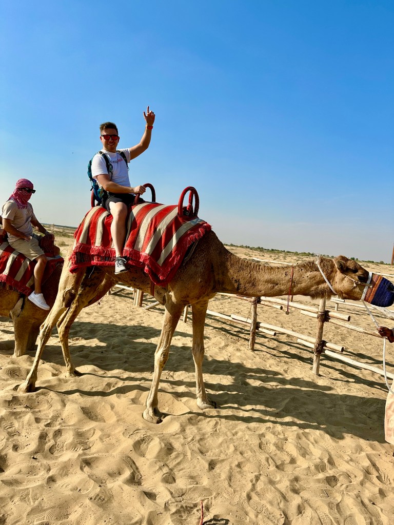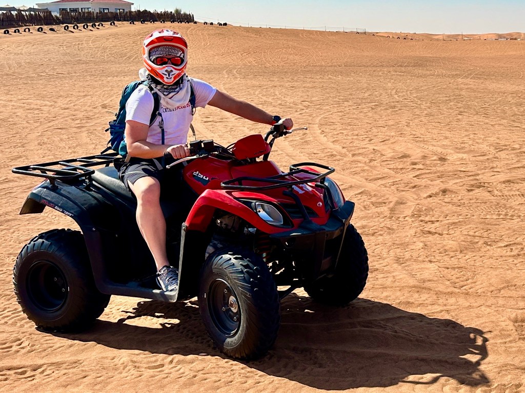 De laatste dag in Dubai was een dag naar de woestijn, ofwel de zandbak die naast de stad ligt! Opgehaald door de, toch enigszins onverstaanbare, Pakistaanse Ali werden we zeer snel zigzaggend naar het avontuur gereden. Allereerst mochten we op een Quadbike rijden, dit was helaas wel op een afgesloten terrein, maar nog steeds wel gaaf om over een paar zandduintjes heen te gassen. Uiteraard hier ook weer meerdere waarschuwingen opgepakt van de lokale instructeurs. Een beetje gas geven blijft toch lachen en er is niks misgegaan!