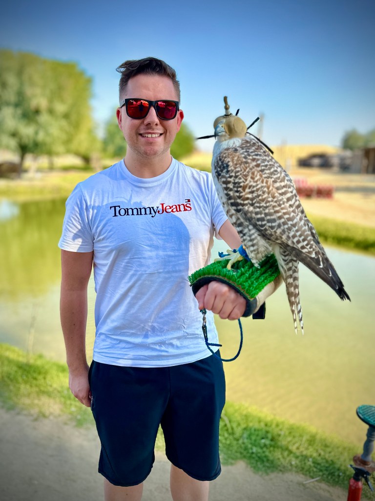 Na een verder stuk rijden kwamen we bij een kampje aan wat een bedouinenkamp moest voorstellen, maar je merkte wel dat dit enigszins kunstmatig was aangelegd. Je mocht hier even 10 seconde op de foto met een roofvogel – die geblinddoekt was – en een zeer kort ritje op een kameel maken, wat uiteindelijk niet meer dan 5 minuten duurde. Wat wel mooi was, was dat we hierna lekker mochten gaan eten van de BBQ. Bij het vleesgedeelte moest ik 3x vragen of ik wat meer kip kon krijgen, want hij gaf maar 2 stukjes per keer. Afin, ik ben uiteraard nog voor een tweede ronde gegaan, want er is nooit genoeg kip!