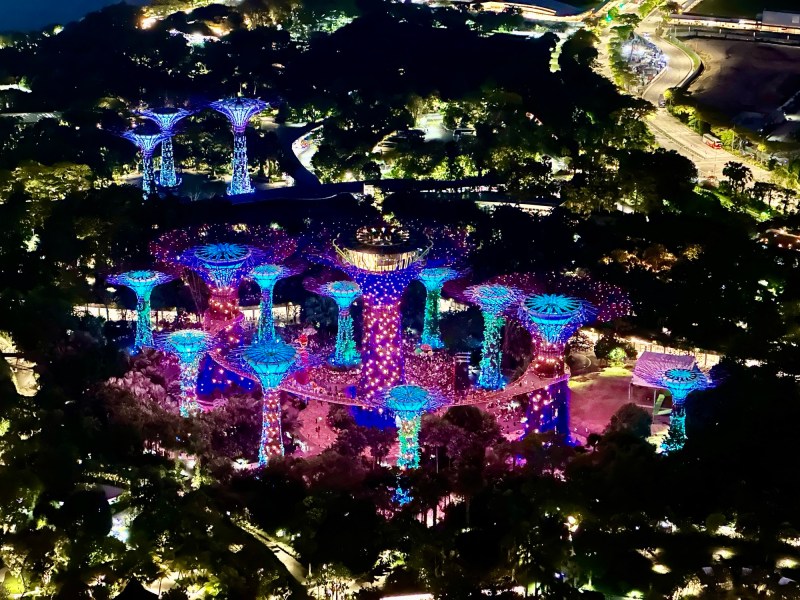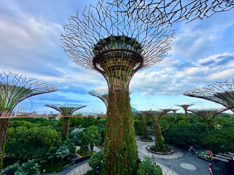 De Marina Bay Sands (kortweg MBS), en eigenlijk de gehele Marina Bay, is gebouwd op land dat 50 jaar geleden gewoon oceaan was. Zo kunnen we nog zien wat voor moois je op dit land kan maken, in plaats van wat we van Flevoland hebben gemaakt. Overigens is het ook zo dat doordat de grond onder de Marina Bay dus minder stevig is dan het ‘vaste land’, aardbevingen uit IndonesiĆ« ook beter te voelen zijn in de gebouwen die op de Marina Bay staan. Maar wat een andere bekende landmark is, is de zogenoemde Gardens by the Bay, een soort futuristische betonnen bomen die uit de grond zijn gestampt en alles verder omringd met veel groen. Al die bomen groeien hier nou eenmaal lekker in dat tropische klimaat. We hebben de dag afgesloten met een diner boven op de MBS waar ik vooral ook wel was om de mooie uitzichten te aanschouwen, de panoramashots tussen het geschiedenisstuk hierboven zijn daar ook genomen, alsmede de foto van de Gardens by the Bay hieronder.