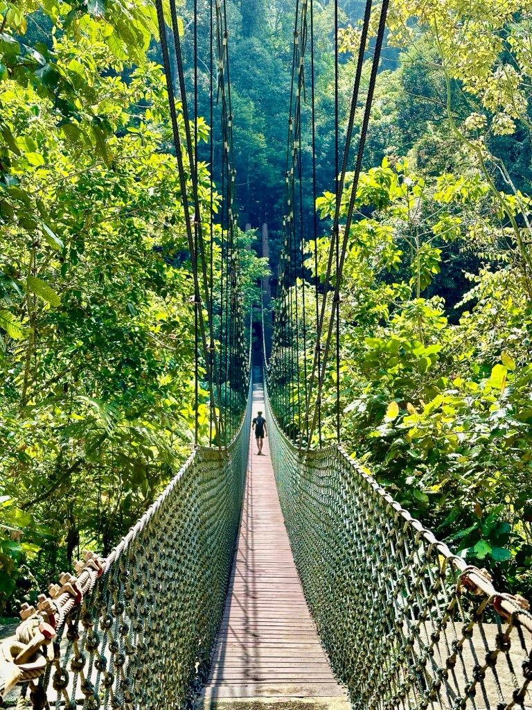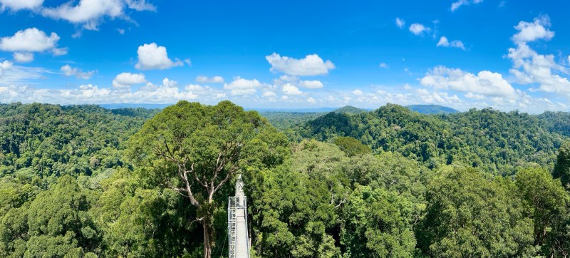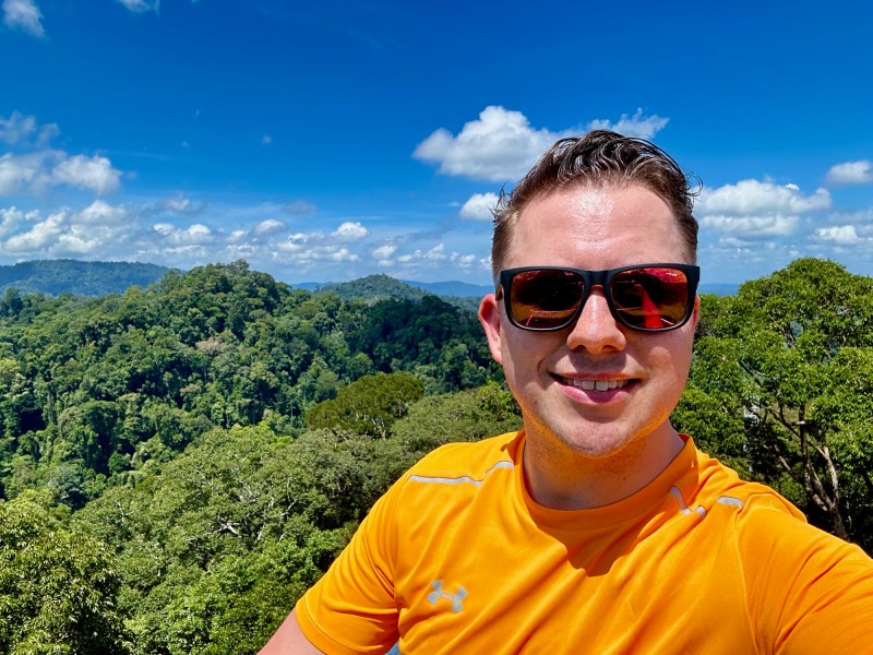 Afijn, nu zijn we weer wat kennis rijker over dit oliestaatje en kan ik jullie vergewissen van mijn avonturen. Ik had een late avondvlucht van Singapore naar Brunei en ik kwam pas rond 1 uur in de nacht aan in mijn hotel. Op zich niet geheel erg, maar toch minder als je de dag erna opgehaald wordt om 07:00 om naar het Ulu Temburong national park te gaan op de exclave van Brunei. Dit stuk land is pas sinds Covid verbonden met het grotere gedeelte van Brunei via een brug van ongeveer 30km, een knap staaltje arbeid weer: er schijnt hier meer dan een miljard USD voor uitgetrokken te zijn. Na een ruim uur rijden en een andere Japanse knakker opgehaald te hebben, kwamen we aan in de rimboe. Hier waren nog twee Koeweitse vrouwen die ook onze groep kwamen joinen om te genieten van het moois van de natuur op Bruneis Borneo. Het begon met een hike naar een Canopy (simpel gezegd een steiger van 45m hoog). De hike zelf was niet zo heel heftig, de zon werd aardig gemaskeerd door de bomen. Daar dachten de hijgende Kuweiters en Japanner met hun 3 lagen aan toch anders over. Enfin, met een semi flashback naar een ander steigermoment (Sven, Ronny & Bas, jullie weten waar ik het over heb), ben ik naar boven geklauterd. Daar had je in de brandende zon een schitterend uitzicht over het oerwoud!
